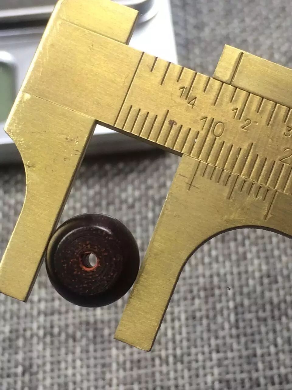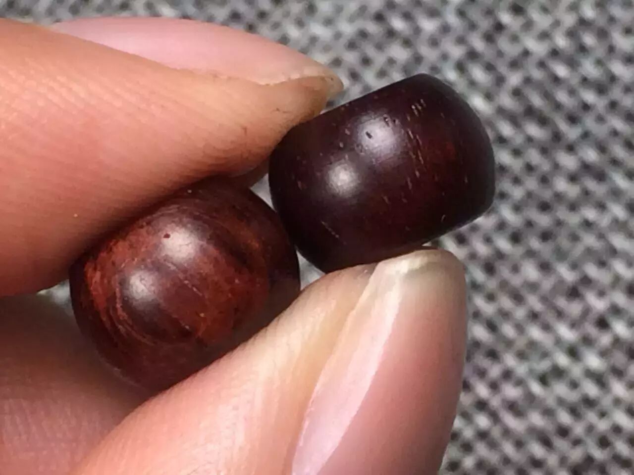 其中左边的珠子就属于紫檀素略低一点所致,颜色稍偏黄,而右边的珠子整体淳厚十足。在直播中我临时兴起,专门把这个鼓珠给拆散,对这两个珠子进行了称重。在称重之前,我宣称右边的会比左边的重,不过我的电子秤只能称到0.1克的精度,对于本身就很小重量的单个珠子而言,没有0.01克的精度估计很难测的出来,不过运气挺好,居然也测出来了。